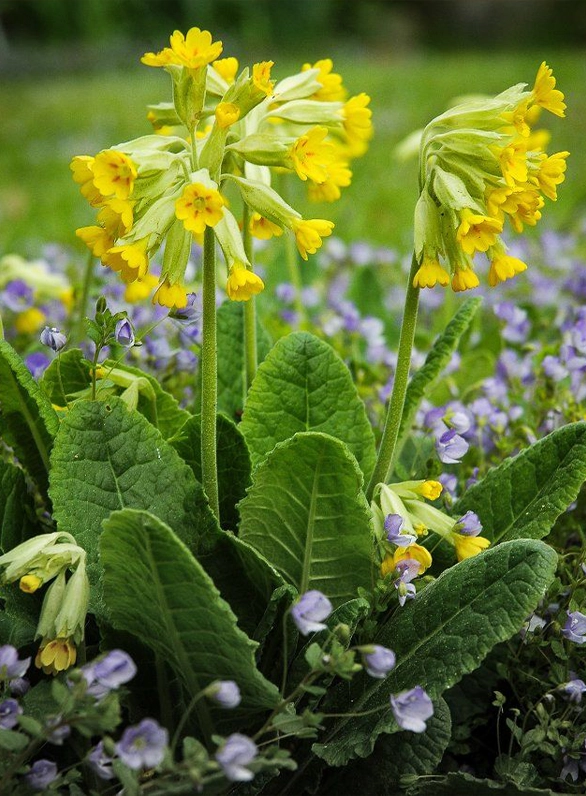 Appearance: Cowslips are low-growing perennials that feature clustered, bright yellow flowers with a distinctive sweet fragrance. The flowers are typically bell-shaped, growing in umbels (a cluster of flowers on short stalks). The plant has ovate, soft green leaves that grow in a rosette at the base.